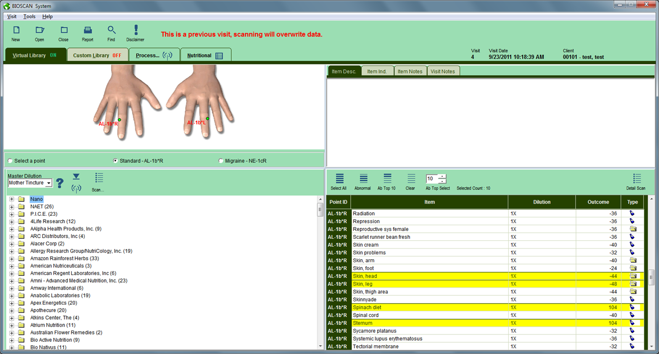 Dit is meestal de start van de therapeut en duurt ongeveer 10 minuten en geeft al een volledig rapport in kleur (en numeriek) met bevindingen die aangeven welke zaken (stressoren) buiten het normale bereik liggen en invloed hebben op de gezondheid. Na het meten van de 100 groepen worden, groep voor groep, de diepere oorzaken van deze stressoren opgespoord en gebalanceerd.